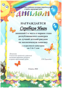 Серебков Иван, воспитанник средней группы 12, занял первое место в первом этапе республиканского конкурса на лучший детский рисунок на экологическую тематику. Поздравить победителя приехали начальник отдела контроля за соблюдением природоохранного законодательства на территории г. Гомеля Дворецкий Юрий Михайлович и главный специалист Скопич Марина Григорьевна. Поздравляем победителя!