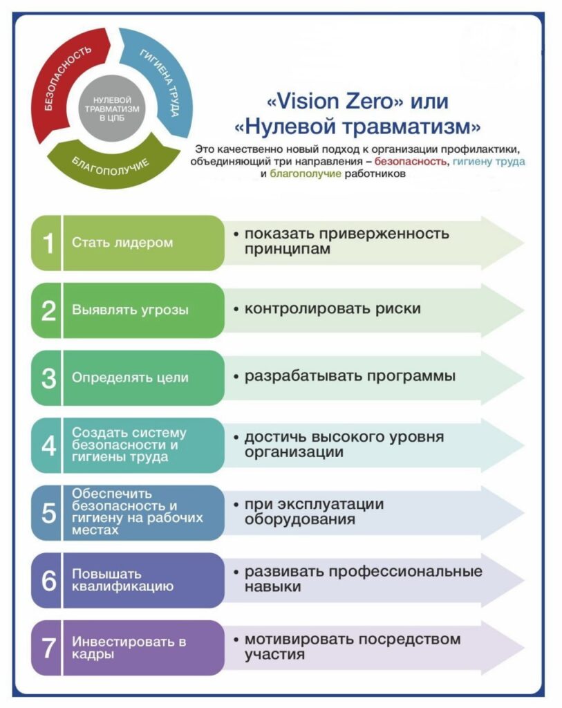 «Vision Zero» или «Нулевой травматизм» – это качественно новый подход к организации профилактики, объединяющий три направления – безопасность, гигиену труда и благополучие работников на всех уровнях производства. Благодаря своей гибкости «Vision Zero» может применяться на любом месте работы, в любой организации и в любой отрасли во всех регионах мира.