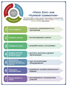 «Vision Zero» или «Нулевой травматизм» – это качественно новый подход к организации профилактики, объединяющий три направления – безопасность, гигиену труда и благополучие работников на всех уровнях производства. Благодаря своей гибкости «Vision Zero» может применяться на любом месте работы, в любой организации и в любой отрасли во всех регионах мира.